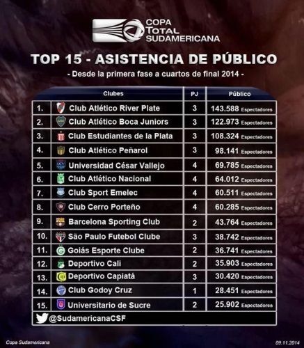 Los otros dos semifinalistas, Atlético Nacional de Colombia y San Pablo de Brasil se ubican 6° y 10° con 64.012 y 38.742 espectadores respectivamente.