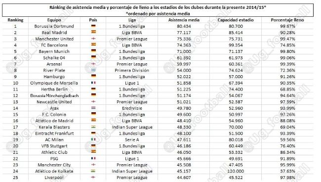Borussia Dortmund, Real Madrid y Manchester United son los tres equipos que más público, en promedio, llevaron a sus respectivos estadios en este 2014. Los datos surgen a partir de un informe de la web Underground Football que relevó a los 100 clubes del mundo con mayor asistencia promedio en la temporada 2014/2015.