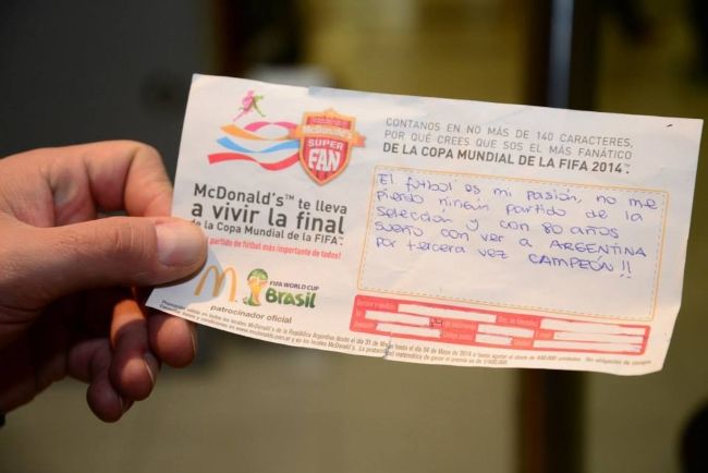 Este bahiense de 79 años ganó semejante premio gracias a un cupón de la promoción SuperFan de McDonald’s en la que tenía que redactar un mensaje creativo de hasta 140 caracteres inspirado en la pasión futbolera. Una de sus nietas fue la que lo ayudó a escribir “El fútbol es mi pasión. Veo todos los partidos de la Selección y con casi 80 años sueño con ver a la Argentina por tercera vez campeón” y, gracias a eso, fue elegido por McDonald’s para ir junto con un acompañante a Río de Janeiro.