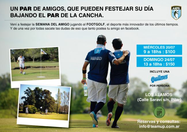 Este día del amigo la AAFG Y Team Up presentan una propuesta innovadora. El miércoles 20 y el domingo 24 de Julio se realizarán jornadas de FootGolf en Los Álamos Golf (Calle Saravi s/n, Pilar) para disfrutar y conocer la magia del deporte.