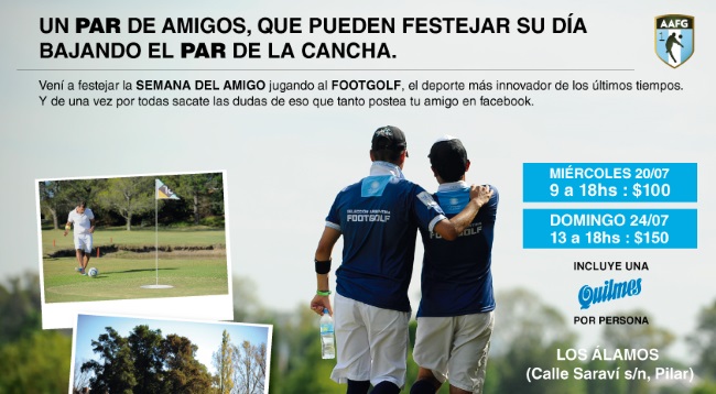Este día del amigo la AAFG Y Team Up presentan una propuesta innovadora. El miércoles 20 y el domingo 24 de Julio se realizarán jornadas de FootGolf en Los Álamos Golf (Calle Saravi s/n, Pilar) para disfrutar y conocer la magia del deporte.