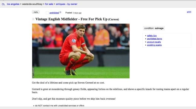 Un hincha de Los Angeles Galaxy, enojado con Steven Gerrard, publicó “en venta a costo cero” al volante inglés. "Consigue la ganga del año y ven a recoger a Steven Gerrard por coste cero. Gerrard es genial deambulando por los campos, tener cara de pocas ideas desde las bandas y tiene un particular don por destrozar equipos de manera frecuente", publicó el fanático, un poco enojado por el regular rendimiento de Gerrard en su arribo a la MLS.