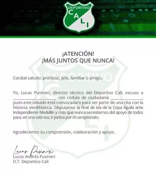 En él puede leerse como el entrenador del equipo, el argentino Lucas Pusineri, excusa a quien utilice la autorización a faltar al compromiso que tenga con el objetivo de asistir al partido. “Disputamos la final de ida de la Copa Colombia ante Independiente Medellín y más que nunca necesitamos del apoyo de todos para, en una sola voz, ir juntos por el campeonato” puede leerse en la autorización.