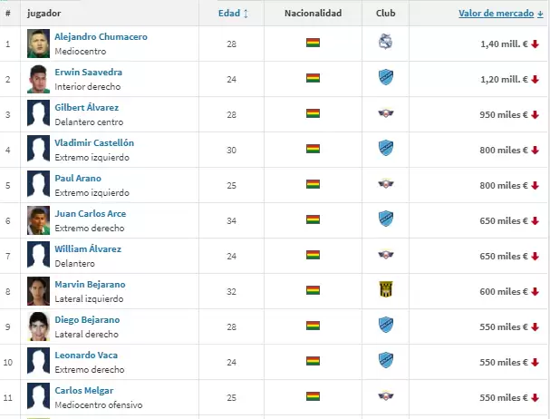 El primero de la lista es Alejandro Chumacero con 1.40 millones de euros de valor. Es el único que juega fuera de país, siendo delantero de Puebla de México desde 2018. Antes tuvo dos etapas en The Strongest y en el medio pasó por Sport Recife de Brasil. Con 28 años de edad, ya lleva más de 10 defendiendo los colores de su Selección.