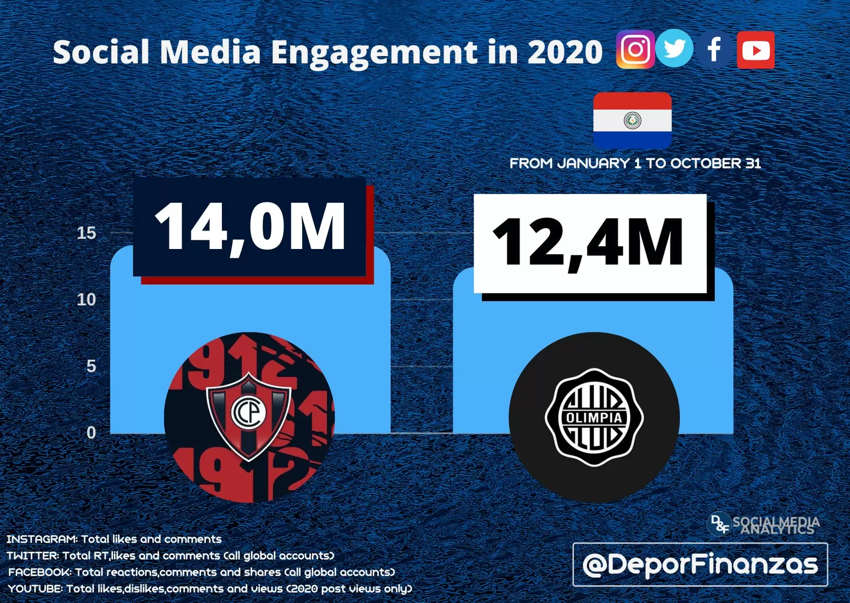 El sitio Deportes & Finanzas reveló un estudio que abarca desde el 1 de enero al 31 de octubre. En total suman 14 millones de interacciones entre las plataformas de Facebook, Instagram, Twitter y YouTube. Su perseguidor más cercano es Olimpia con un alcance de 12.4 millones, y de esta manera queda remarcado que no sólo son rivales dentro del campo de juego, sino que también en las redes sociales. Ambos son los equipos más importantes de Paraguay.