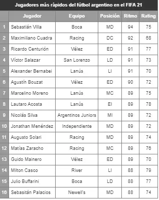 En cuanto al fútbol argentino, Sebastián Villa es el más rápido de todos con 94 de ritmo. Con 2 puntos menos lo sigue Maximiliano Cuadra (92) y más atrás aparecen Ricardo Centurión (91), Víctor Salazar (91) y Alexander Bernabei (91).