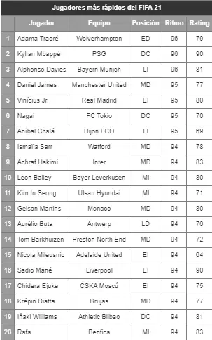 Ahora se filtraron quiénes son los jugadores más rápidos, con una sorpresa en el primer puesto del ranking. Seguramente muchos imaginaban que Kylian Mbappé ocuparía ese lugar, pero no es así. El futbolista que se quedó con esa marca es Adama Traoré con una calificación de 96 de ritmo pero con un punto más de aceleración.