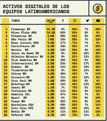 El estudio engloba las principales redes sociales como Instagram, Twitter, Facebook y YouTube, y los clubes de fútbol más populares de América Latina. De cada uno se tomaron los números de seguidores, interacciones totales, relativas (eficiencia de las publicaciones) y una métrica que analiza web analytics, las noticias en la prensa y performance en las redes sociales.