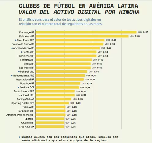 El primer análisis que se puede sacar del gráfico es la superioridad de Flamengo. Al tener un gran número de seguidores, su tasa de fan engagement es la más alta del continente. En segundo lugar, queda bien reflejado el dominio de los clubes brasileños ante el resto. De los 26 seleccionados, 16 son de Brasil. Los restantes son: 4 de México, 2 de Argentina, 1 de Colombia, Chile, Uruguay y Ecuador.