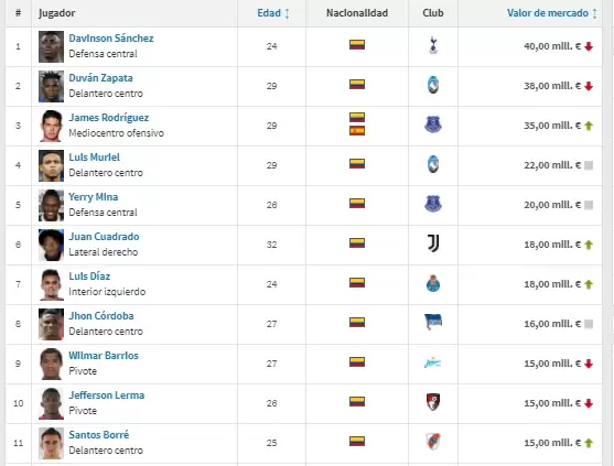 El líder del ranking es Davinson Sánchez (Tottenham) con un valor de 48.500.000 dólares. En segundo lugar aparece Duván Zapata (Atalanta) con 46.000.000 y en tercera posición James Rodríguez (Everton) con una cotización de 42.400.000 dólares.