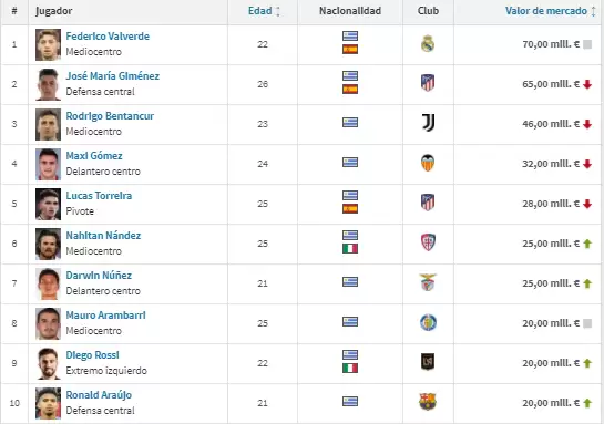 Volviendo al Top 10, el que se ubica en la cima es Federico Valverde con 84.800.000 dólares, seguido por José María Giménez con 78.800.000. Rodrigo Bentancur con 55.7000.000 dólares cierra el podio. Es importante remarcar que, a diferencia de estos rankings, los primeros lugares no están ocupados por delanteros como es habitual.