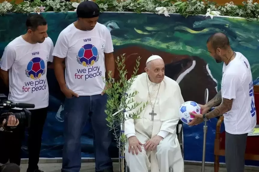 El encuentro se desarrolló en el marco del lanzamiento de la Escuela Laudato Si, inspirada en la encíclica de Su Santidad, junto a estudiantes de varios países de América Latina y Europa en el aula magna de la Universidad Urbaniana. Tal fue el escenario en el que los atletas recibieron del Papa Francisco la Pelota de la Paz bendecida con la que se jugará este partido, del que participarán las máximas figuras y leyendas del fútbol internacional.