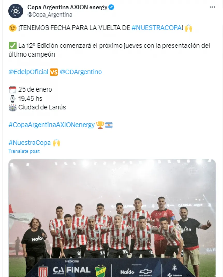 La Copa Argentina 2024 ya tiene confirmado su primer partido y tendrá la presencia del último campeón, Estudiantes de La Plata, que se medirá ante Club Deportivo Argentino de Monte Maíz.