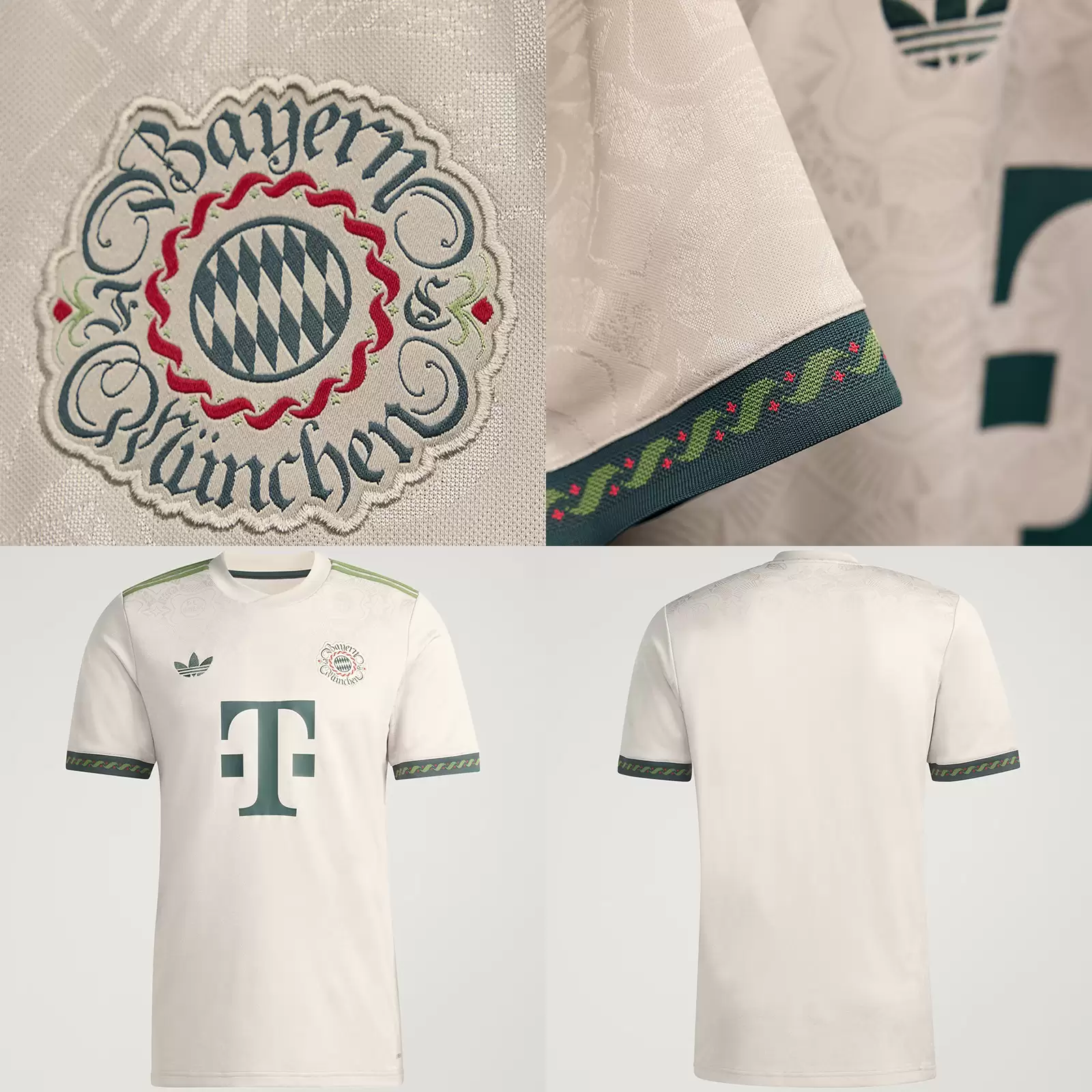 El Bayern de Múnich ha presentado oficialmente su camiseta especial para la Oktoberfest 2025-26. El diseño, creado por adidas, destaca por un elegante jacquard sobre fondo beige con detalles en color oliva, evocando los bordados típicos y los tonos de los tradicionales pantalones bávaros de cuero (Lederhosen).