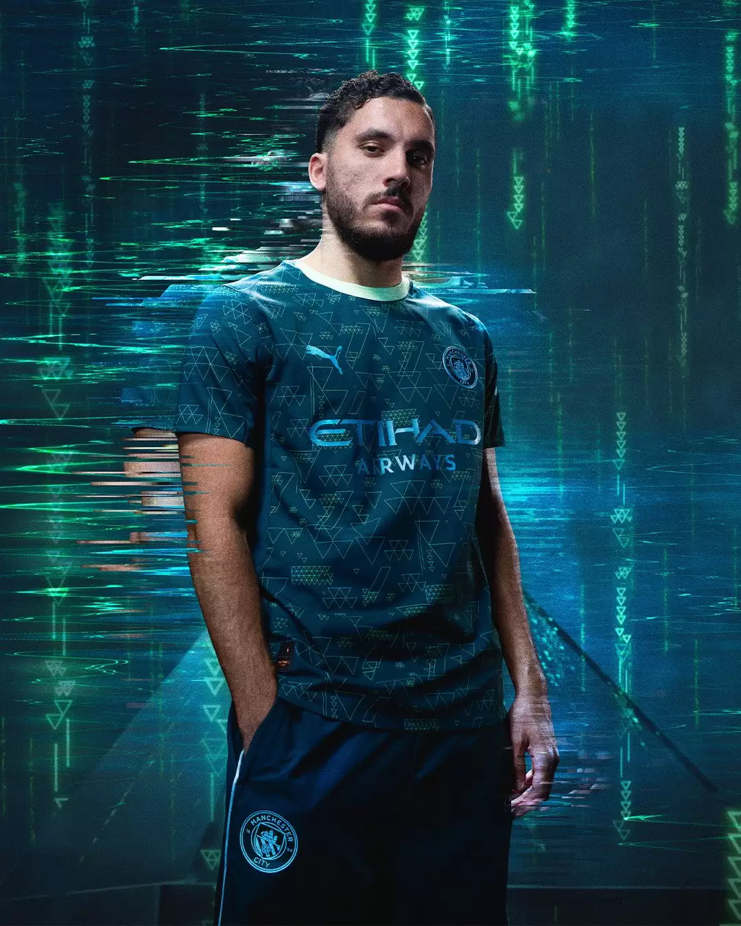 El diseño de la nueva equipación presenta un triángulo como elemento central, símbolo de la identidad visual de EA SPORTS FC, que también evoca el característico estilo técnico y atractivo del Manchester City. En una paleta que combina llamativos tonos verdes, la camiseta presenta una base verde bosque oscuro con gráficos triangulares turquesa y efectos metálicos, y un cuello verde claro.