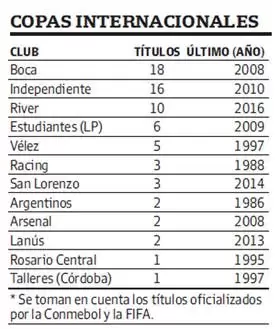Actualmente, en certámenes reconocidos por FIFA y CONMEBOL, el Xeneize cuenta con 18 títulos (6 Libertadores, 4 Recopas, 3 Intercontinentales, 2 Sudamericanas, 1 Supercopa Sudamericana, 1 Copa Máster y 1 Copa de Oro), mientras que los de Avellaneda totalizan 17 títulos (7 Libertadores, 3 Interamericanas, 2 Intercontinentales, 2 Supercopas, 2 Sudamericanas, 1 Recopa).