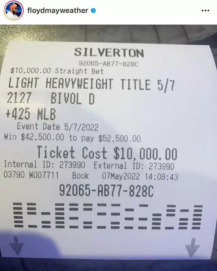 En esta oportunidad, el estadounidense apostó 10.000 dólares a la derrota del mexicano Saúl Canelo Álvarez, que solo había perdido una sola pelea en su carrera ante justamente el estadounidense, ganó 52.500 dólares y subió un posteo a Instagram donde mostró el ticket y escribió: “Ganancia fácil”