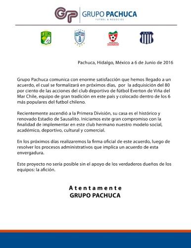 En Everton, se buscará replicar este modelo, con la idea de potenciar al máximo la marca propia del club. “Grupo Pachuca comunica con enorme satisfacción que hemos llegado a un acuerdo, el cual se formalizará en los próximos días, por la adquisición del 80 por ciento de las acciones del club deportivo de fútbol Everton de Viña del Mar, equipo de gran tradición en este país y colocado dentro de los seis más populares del fútbol chileno”, dice el comunicado oficial.
