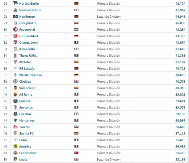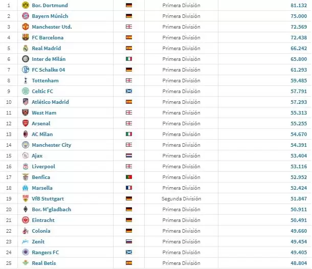 El resto de equipos que completan los primeros diez lugares de este ranking son también del continente europeo. El Inter de Milán, en el sexto puesto, es el primer equipo italiano del ranking con un promedio de 65.800 espectadores por partido. Le siguen: Schalke 04 (61.293 espectadores), Tottenham (59.485), Celtic (57.791) y en el décimo lugar el Atlético de Madrid (57.293).