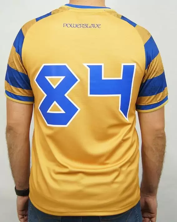 La segunda es amarilla con jeroglíficos, en referencia a la imaginería detrás del disco “Powerslave”. Atrás, en la espalda, el “84” corresponde al año en que el álbum fue puesto en venta.