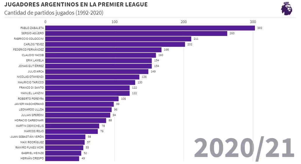 El jugador con más presencias es Pablo Zabaleta con un total de 303 partidos, repartidos entre Manchester City y West Ham. Actualmente, el defensor está sin equipo luego de dejar el West Ham a mitad de 2020. Zabaleta jugó 9 temporadas en el City y en varias ocasiones fue elegido capitán del equipo. Su último paso en la Premier fueron 2 ediciones con los Hammers.