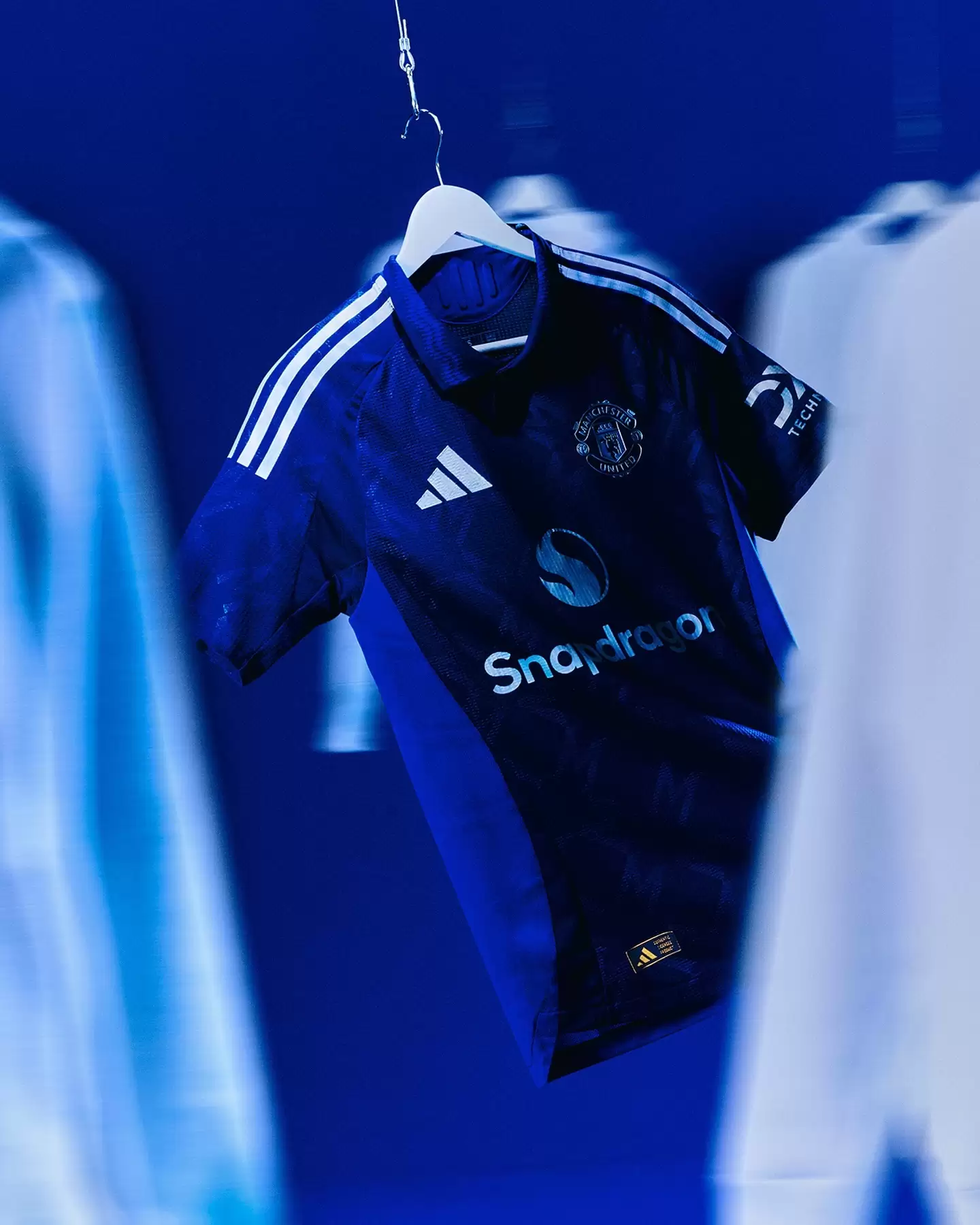 El elemento texturizado en azul real, aplicado como una serie de patrones circulares repetidos sobre una base azul marino, es un homenaje a los monogramas en 3D que se veían con frecuencia en los uniformes del Manchester United de hace 30 años.