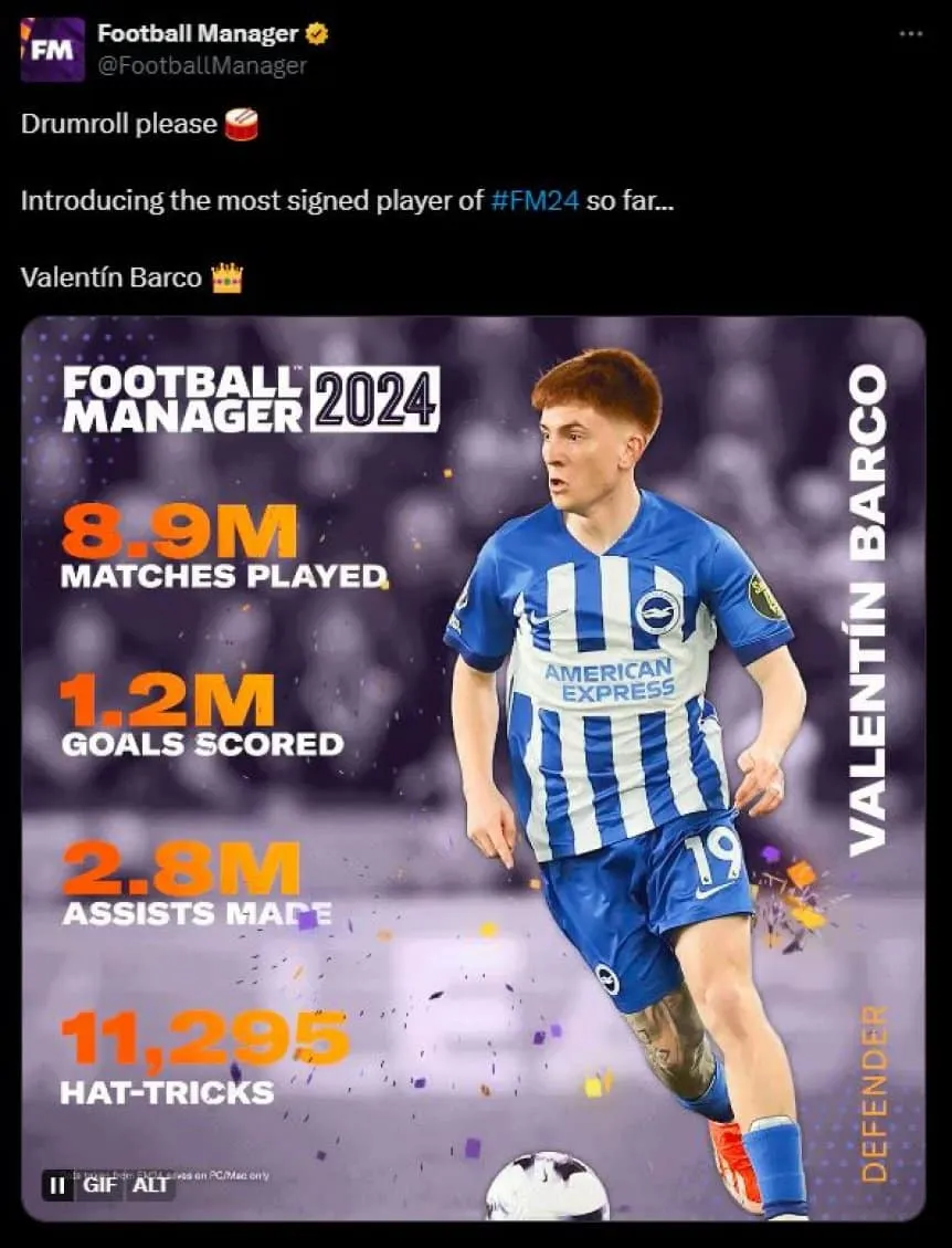 Tal como publicó la cuenta oficial de Football Manager 24 en redes sociales, Barco fue el jugador más comprado en lo que va desde el lanzamiento de esta nueva versión del simulador de gestión futbolística más popular del mundo. El mismo Colo posó con una camiseta del Brighton con la inscripción: "Most signed", qué significa que fue el jugador más incorporado en el juego.