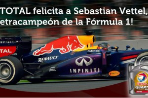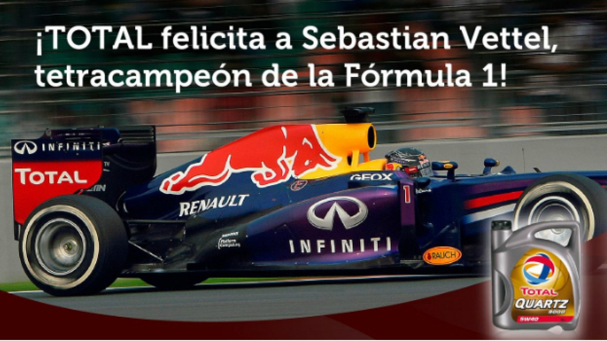 Total, empresa líder en el mercado de lubricantes, celebra junto al Infiniti Red Bull Racing Team el cuarto triunfo consecutivo de Sebastian Vettel en la Fórmula 1, convirtiéndose así en el piloto más joven de la historia en ser tetracampeón de la máxima categoría de automovilismo.