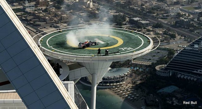 Ahora, Red Bull decidió celebrar el nuevo título de F1, con David Coulthard, piloto de la escudería, quien giró en el helipuerto del hotel más lujoso de Dubai, el Burj Al Arab, que está a 321 metros de altura.