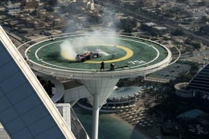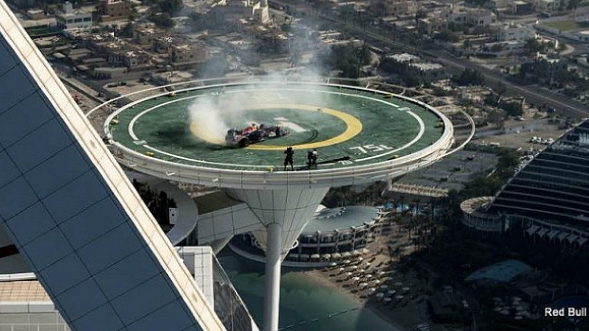 Ahora, Red Bull decidió celebrar el nuevo título de F1, con David Coulthard, piloto de la escudería, quien giró en el helipuerto del hotel más lujoso de Dubai, el Burj Al Arab, que está a 321 metros de altura.