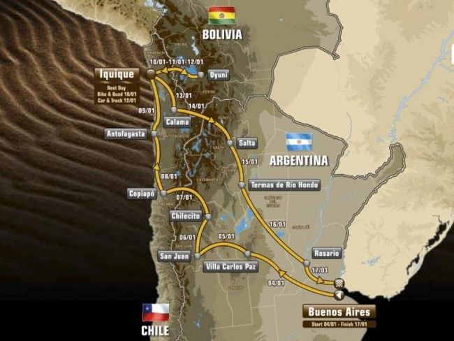 El Rally Dakar 2015 tendrá etapas en Argentina, Chile y Bolivia (sólo autos y motos, no camiones). Tras el comienzo en Baradero, irán hacia Villa Carlos Paz en Córdoba, donde seguirá la competencia de la siguiente manera: 5 de enero Villa Carlos Paz-San Juan. 6 de enero San Juan-Chilecito. 7 de enero Chilecito-Copiapó (Chile). 8 de enero Copiapó-Antofagasta (Chile). 9 de enero Antofagasta-Iquique (Chile). 10 de enero Iquique-Uyuni (Bolivia) (descanso motos). 11 de enero Uyuni-Iquique. 12 de enero Uyuni-Iquique (descanso autos y camiones). 13 de enero Iquique-Calama (Chile). 14 de enero Calama-Salta. 15 de enero Salta-Termas Río Hondo. 16 de enero Termas Río Hondo-Rosario. 17 de enero Rosario-Buenos Aires.
