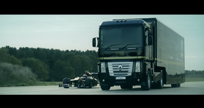 Juntos batieron el récord mundial de salto de camión. El mismo recorrió en el aire 26.695 metros con el ingrediente extra, y nada despreciable, de un auto Lotus-Renault de la F1 pasándole por abajo a toda velocidad.