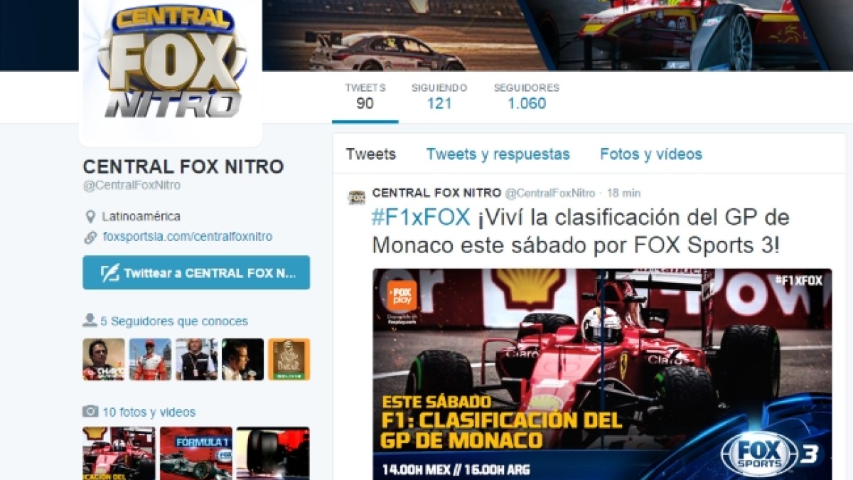 La programación de Fox Sports 3, y en especial toda la referida al automovilismo, tiene nuevas vías de comunicación. En Twitter, todos los fanáticos podrán seguir las últimas novedades en la cuenta @CentralFOXNitro y en la web www.foxsportsla.com/CentralFOXNitro estarán resúmenes de todas las categorías que televisa el canal.