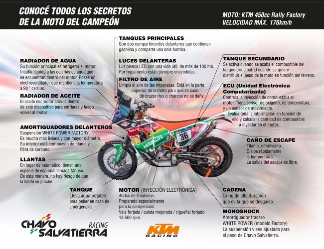 En fin, la moto de Chavo Salvatierra tiene muchos detalles más que dejan en claro que para correr es importante combinar potencia y tecnología. Una de las preguntas que siempre se plantean con relación a la KTM 450 Rally es cuánto cuesta. La versión de esta moto que se fabrica para ponerse al mercado puede llegar a valer hasta 25.000 dólares. La que usa Chavo no se vende y es fabricada especialmente para competir.