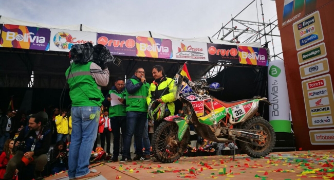 Las montañas andinas han sido testigos de una jornada histórica para Juan Carlos Salvatierra. Compitiendo frente a los mejores del mundo, el piloto boliviano logró el noveno lugar en la quinta etapa del Rally Dakar 2017, que se corrió hoy entre Tupiza y Oruro.