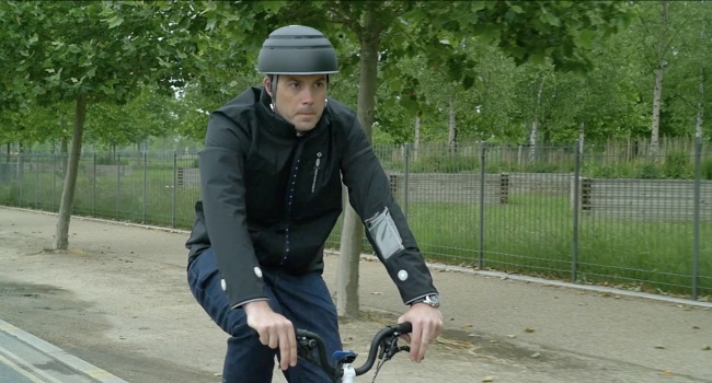 Este prototipo de campera inteligente cuenta con mangas que se iluminan para señalizar cuando los usuarios planean girar a la derecha o a la izquierda. Además, tiene conectada de forma inalámbrica un Smartphone y una aplicación de navegación para bicicletas que hace vibrar la manga para que el usuario sepa por dónde ir, utilizando de mejor manera las rutas.