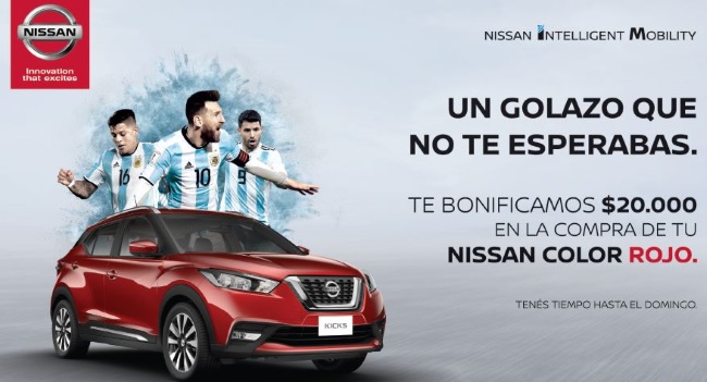 Aprovechando el agónico gol que anotó Marcos Rojo y que le dio a la Selección Nacional de Argentina la clasificación a octavos de final en el último mundial de fútbol, Nissan lanzó la campaña donde homenajeó al jugador que marcó el gol, bonificando $20.000 en la compra de cualquier modelo rojo de la marca. A partir de esta campaña, las ventas de autos rojos fueron el 48% de las ventas totales. Es decir, 4 veces más que las ventas de este color en 2017.