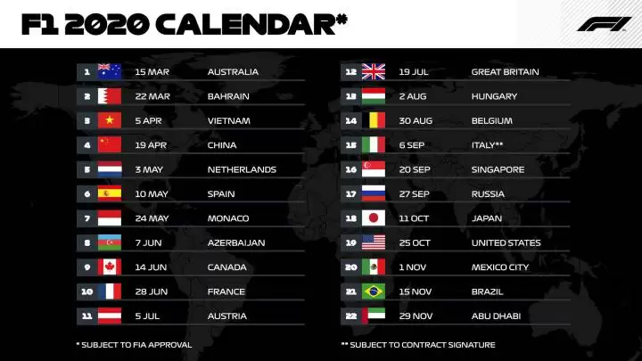La Fórmula 1 anunció el calendario tentativo para la temporada 2020, el cual contará con 22 circuitos, una marca record para la categoría.