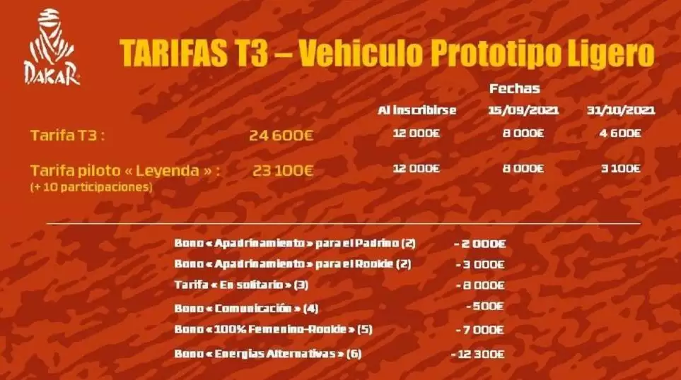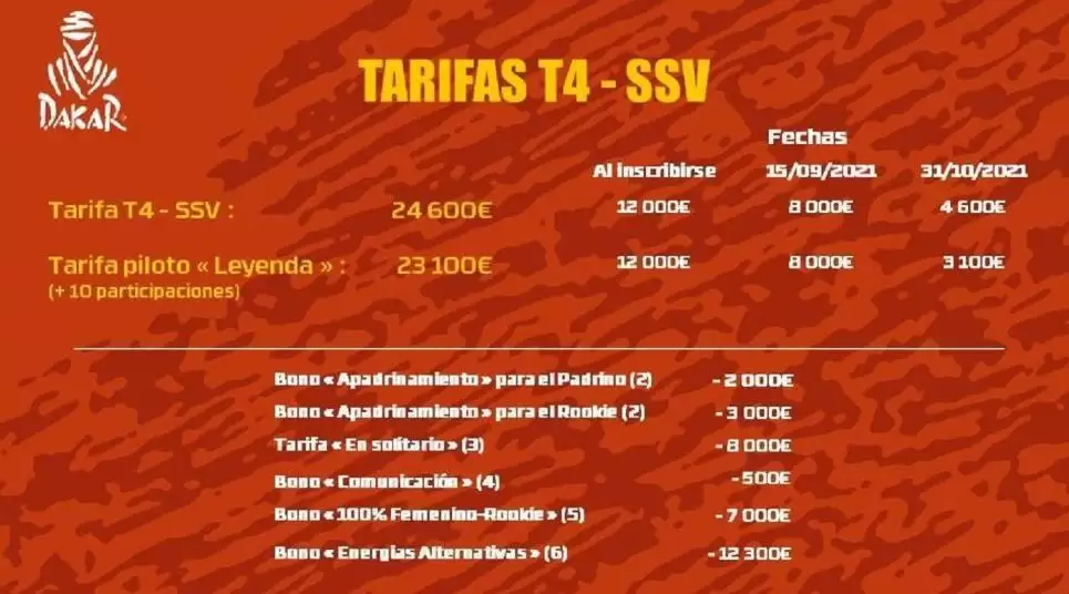 Por ejemplo, quienes quieran participar del Rally Dakar en la categoría motos o cuatriciclos tendrá que informar cuál es su experiencia en las competencias. Se les requiere la participación en una o más de las carreras clasificatoria para el Dakar bajo la etiqueta 'Road to Dakar', una etapa del Campeonato Mundial de la FIM y/o cualquier otro evento del calendario de la FIM o de su calendario nacional, o varias etapas del Campeonato Mundial de BAJA.