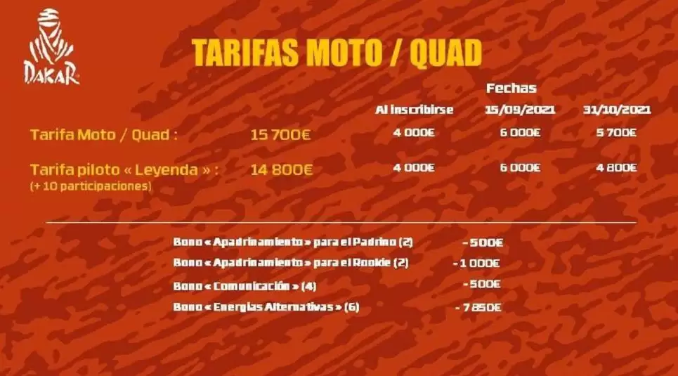Todos los competidores de motos y quads que deseen inscribirse por primera vez en el Dakar deberán enviar, por correo electrónico o postal, un expediente que presente su proyecto. Se prestará especial atención a la experiencia.
