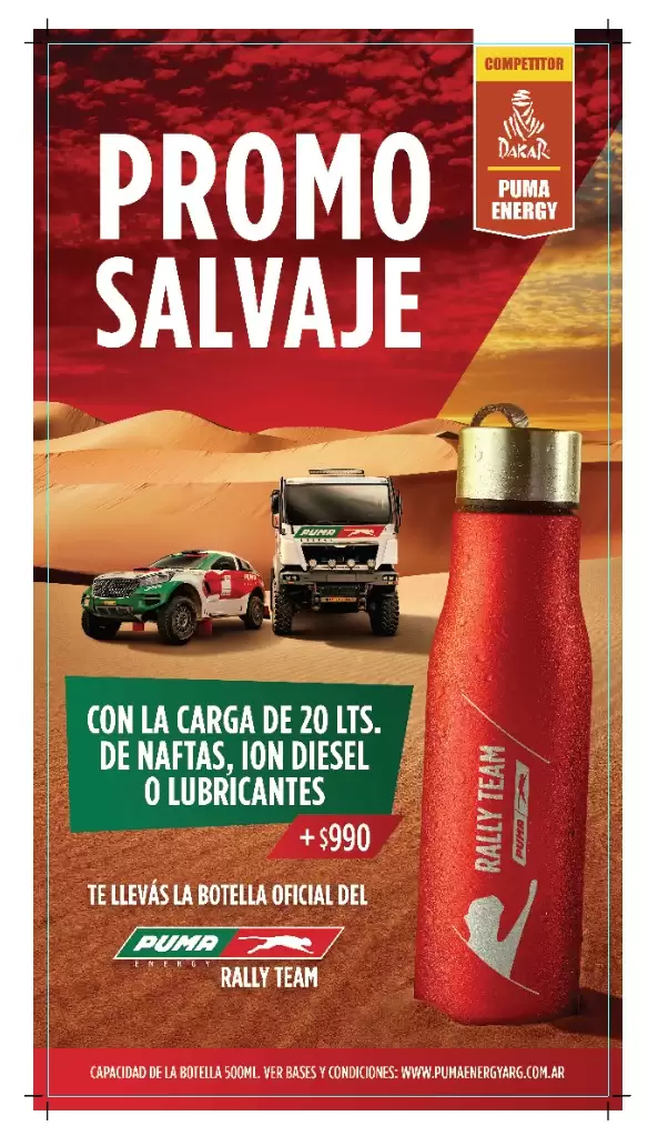 Puma Energy continúa con los preparativos rumbo al Rally Dakar 2022, la competencia deportiva más exigente a nivel internacional que se desarrollará del 2 al 14 de enero del próximo año en Arabia Saudita con formato reducido y sin cruce de fronteras.Así, con el fin de impulsar acciones para acompañar esta gran aventura, la empresa líder en el mercado global de la energía presentó la nueva “Promo Salvaje”, un beneficio exclusivo para sus clientes. Quienes deseen participar deberán cargar 20 litros de combustibles o lubricantes en una Estación de Servicio de la Red Puma y, con la suma adicional de $990, se llevarán la botella oficial del Puma Energy Rally Team.