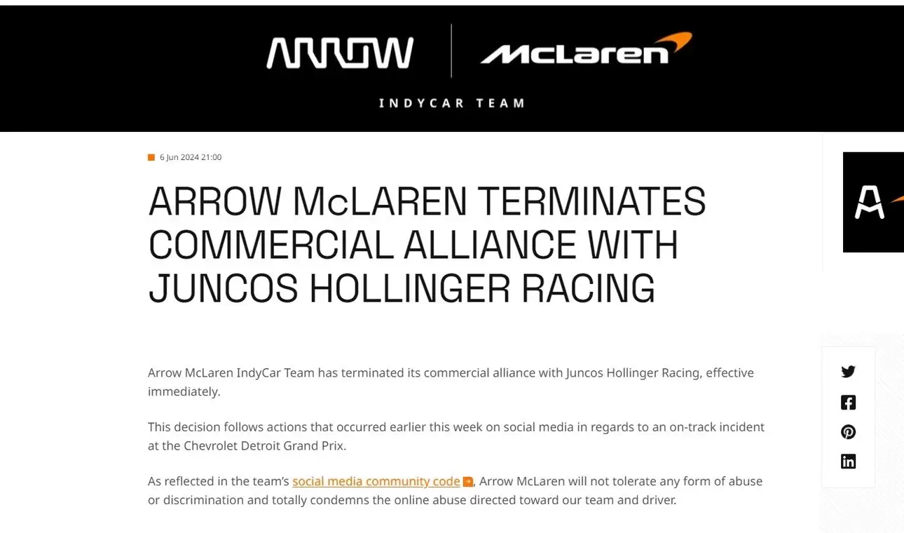 “Arrow McLaren IndyCar Team ha terminado su alianza comercial con Juncos Hollinger Racing, con efecto inmediato. Esta decisión sigue a las acciones que ocurrieron a principios de esta semana en las redes sociales con respecto a un incidente en la pista en el Gran Premio Chevrolet de Detroit. Como se refleja en el código de la comunidad de redes sociales del equipo, Arrow McLaren no tolerará ningún tipo de abuso o discriminación y condena totalmente el abuso en línea dirigido a nuestro equipo y al conductor”, anunció el comunicado publicado por el equipo McLaren.