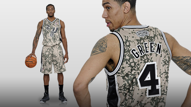 La ciudad de San Antonio es el hogar de la Base Conjunta San Antonio, una instalación militar que incluye la fortaleza del Ejército Sam Houston, la Base de la Fuerza Aérea Randolph y la Base de la Fuerza Aérea Lackland. Debido a esto, adidas decidió diseñar una camiseta homenaje a los hombres y mujeres que sirvieron en las Fuerzas Armadas a lo largo de la historia. Así, el 13 de noviembre y el 28 de febrero, en las visitas de los Washington Wizards y los Charlotte Bobcats a la ciudad, los Spurs vestirán esta indumentaria especialmente creada para rendirle homenaje a los héroes. "Les debemos una deuda de gratitud y es un honor para reconocer y mostrar su apoyo a todos los miembros militares activos y jubilados" señaló Danny Green, escolta del equipo de Emanuel Ginóbili.