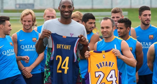 Mientras el Barcelona realiza su pretemporada en Estados Unidos, Kobe Bryant fue uno de los que visitaron al equipo Culé. Piqué e Iniesta fueron quienes más interactuaron con el jugador de Los Angeles Lakers, quienes luego intercambiaron camisetas, entregándole la prenda del equipo oficial de básquetbol del Barcelona.