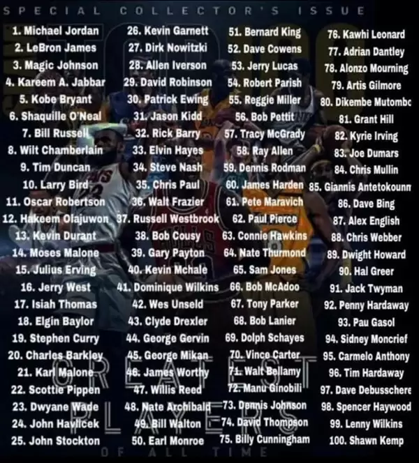 En un estudio reciente publicado por la revista Slam Magazine de los Estados Unidos se reveló a los 100 mejores jugadores de la historia de la NBA con algunas inesperadas sorpresas.