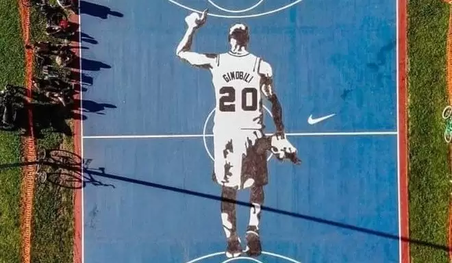 Con la silueta del ex jugador de los San Antonio Spurs posando con su tradicional dorsal número 20 y con un pulgar arriba, el bahiense fue el encargado de firmar la obra con un aerosol este viernes que pasó a visitar “su cancha”.