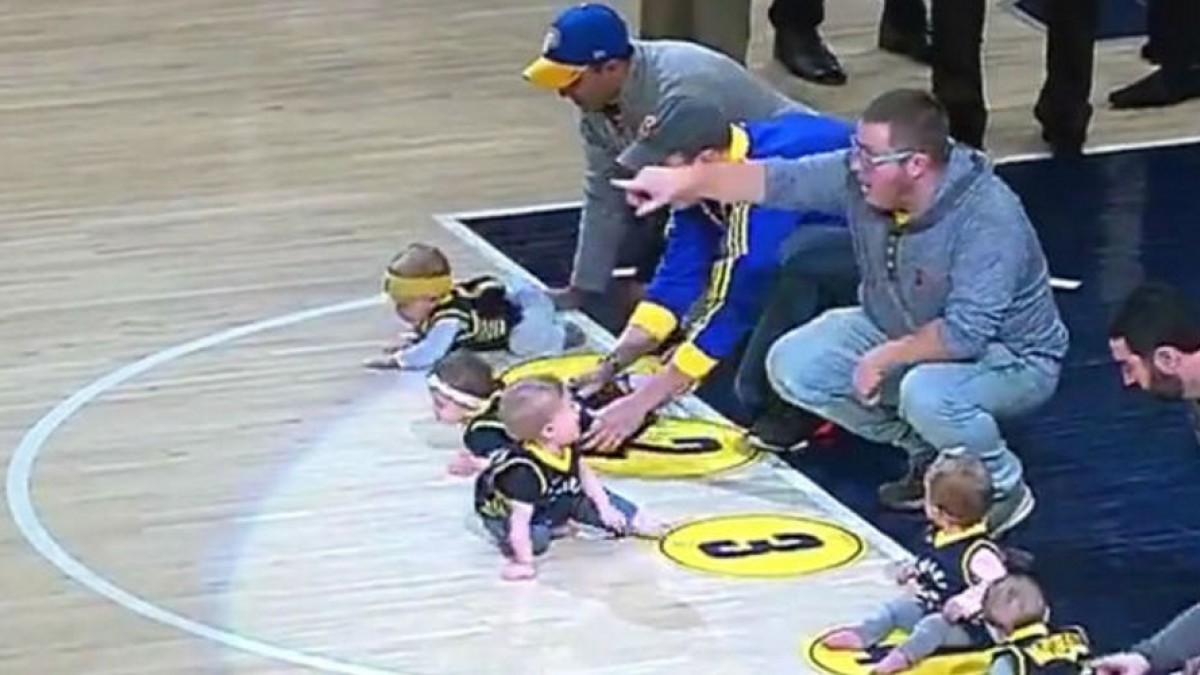 El público de los Indiana Pacers aprovechó para inscribir a sus bebés en una carrera que se disputó durante la mitad del partido. Los padres dejaron a sus bebés para que gatearan varios metros hasta llegar a la línea de meta donde los esperaban con los brazos abiertos.