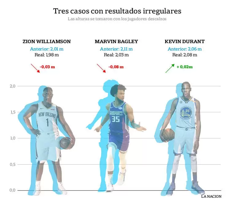Durante ese control se pudo ver que Kevin Durant creció dos centímetros (de 2,06 a 2,08) y que Zion Williamson, el jugador que hasta el momento se lleva todas las miradas, dejó de medir 2,01 y pasó a 1,98.