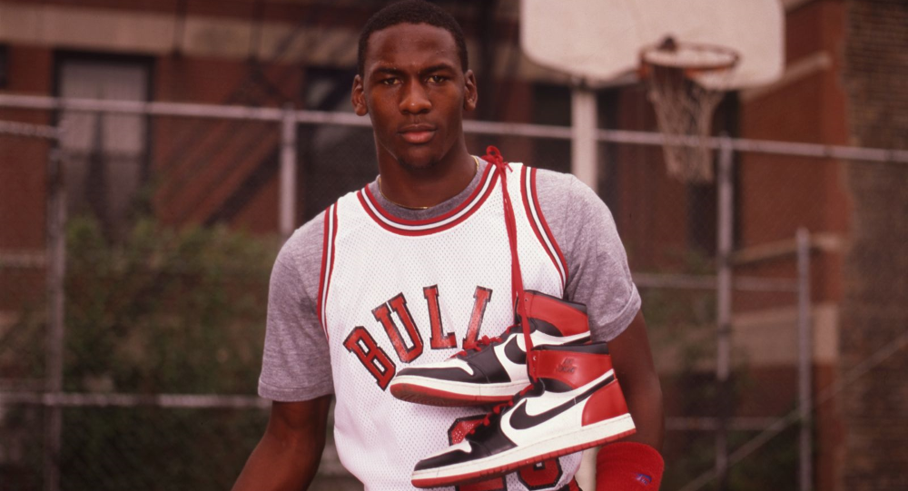 Las Air Jordan 1s, diseñadas para Jordan en 1985, son un emblema para el básquet y la marca deportiva, porque fueron las primeras zapatillas de deporte de la firma. Como casi todos los calzados de la estrella de los Chicago Bulls, la numeración de los pies no coincide, el izquierdo es 13 UK y el derecho 13,5. El diseño lleva los colores de la franquicia (rojo, negro y blanco) y un swoosh más grande que lo habitual. Además, cuentan con la primera insignia de Air Jordan y el logo de Nike Air.