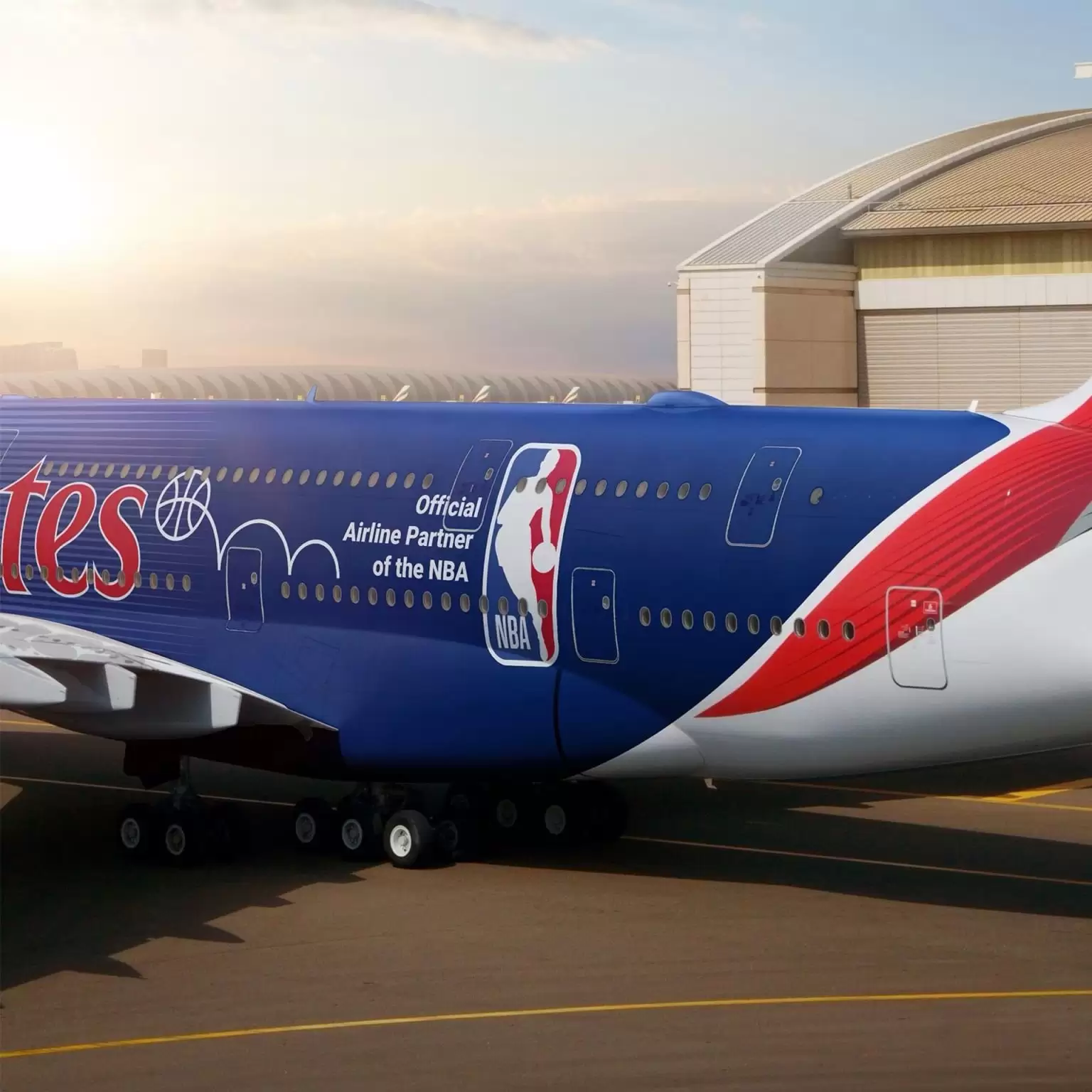 La nueva linea se distingue por un elegante degradado azul que cubre todo el fuselaje, a excepción de la cola del avión, que continúa luciendo la bandera de los Emiratos Árabes Unidos. El característico lettering dorado de Emirates ha sido reemplazado por un vibrante color rojo, acompañado del logotipo de la NBA y una ilustración de un balón rebotando entre ambos emblemas. Los motores también han sido transformados con cubiertas rojas y la caligrafía del logotipo de la aerolínea ahora es blanca.